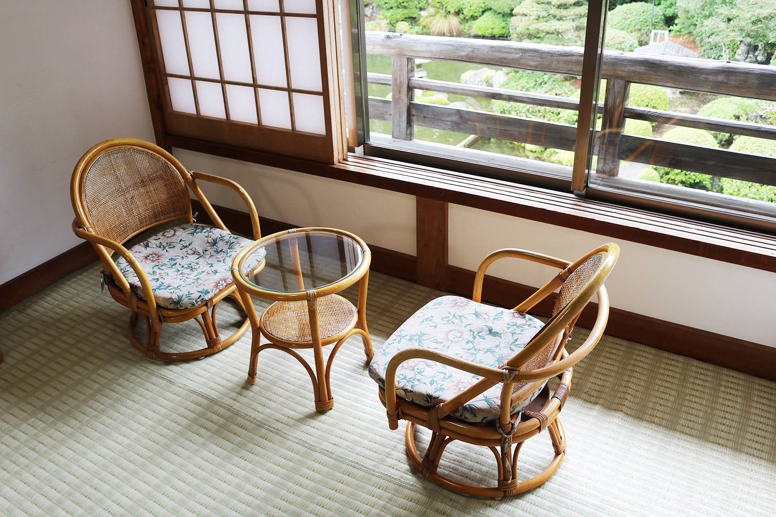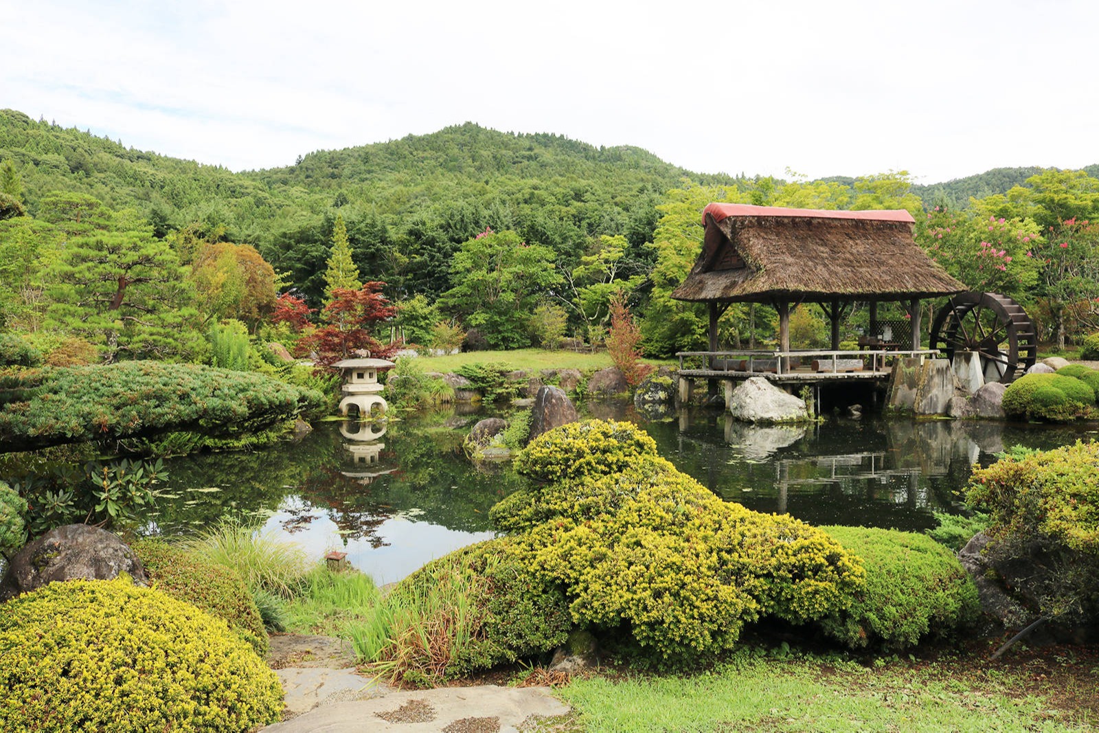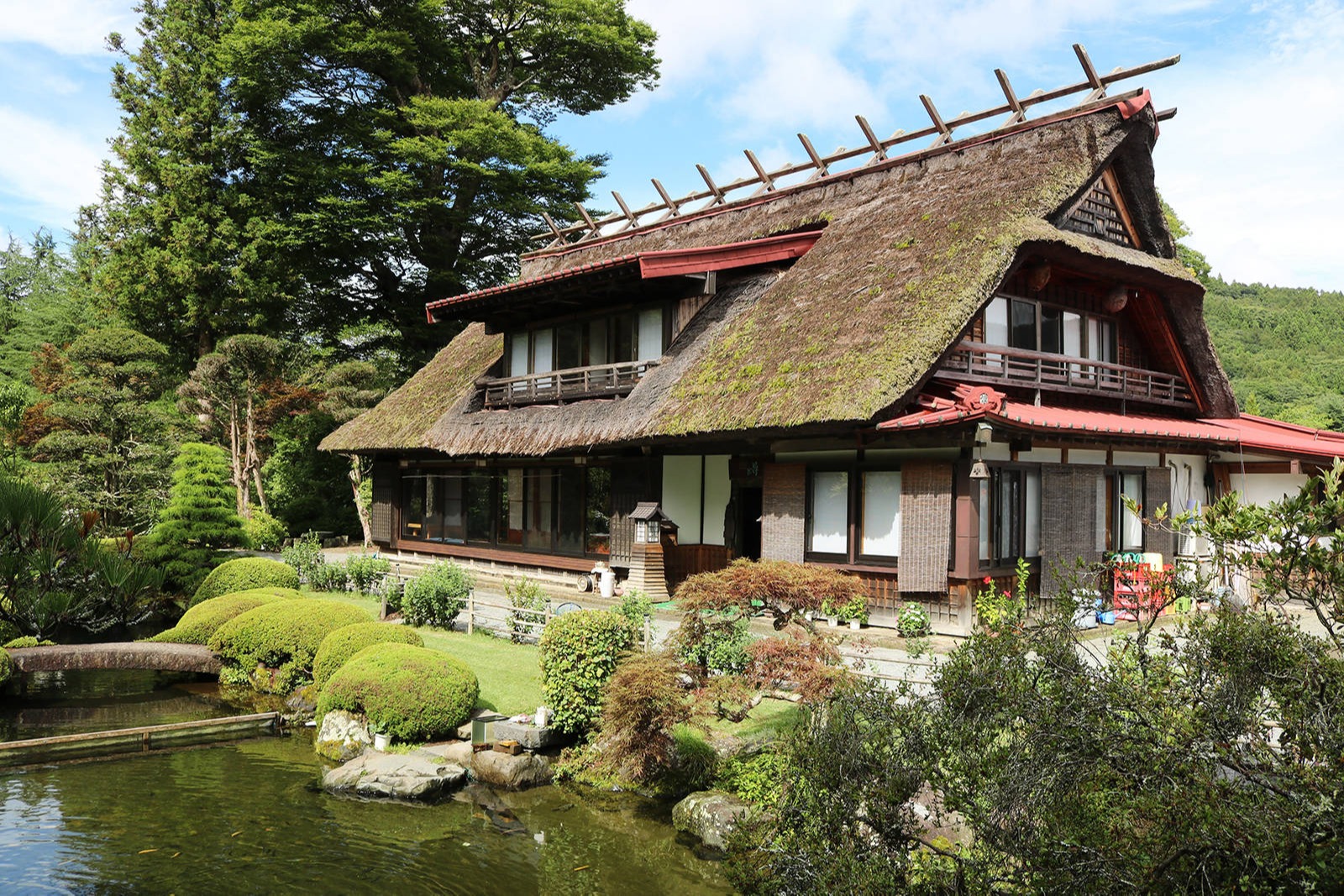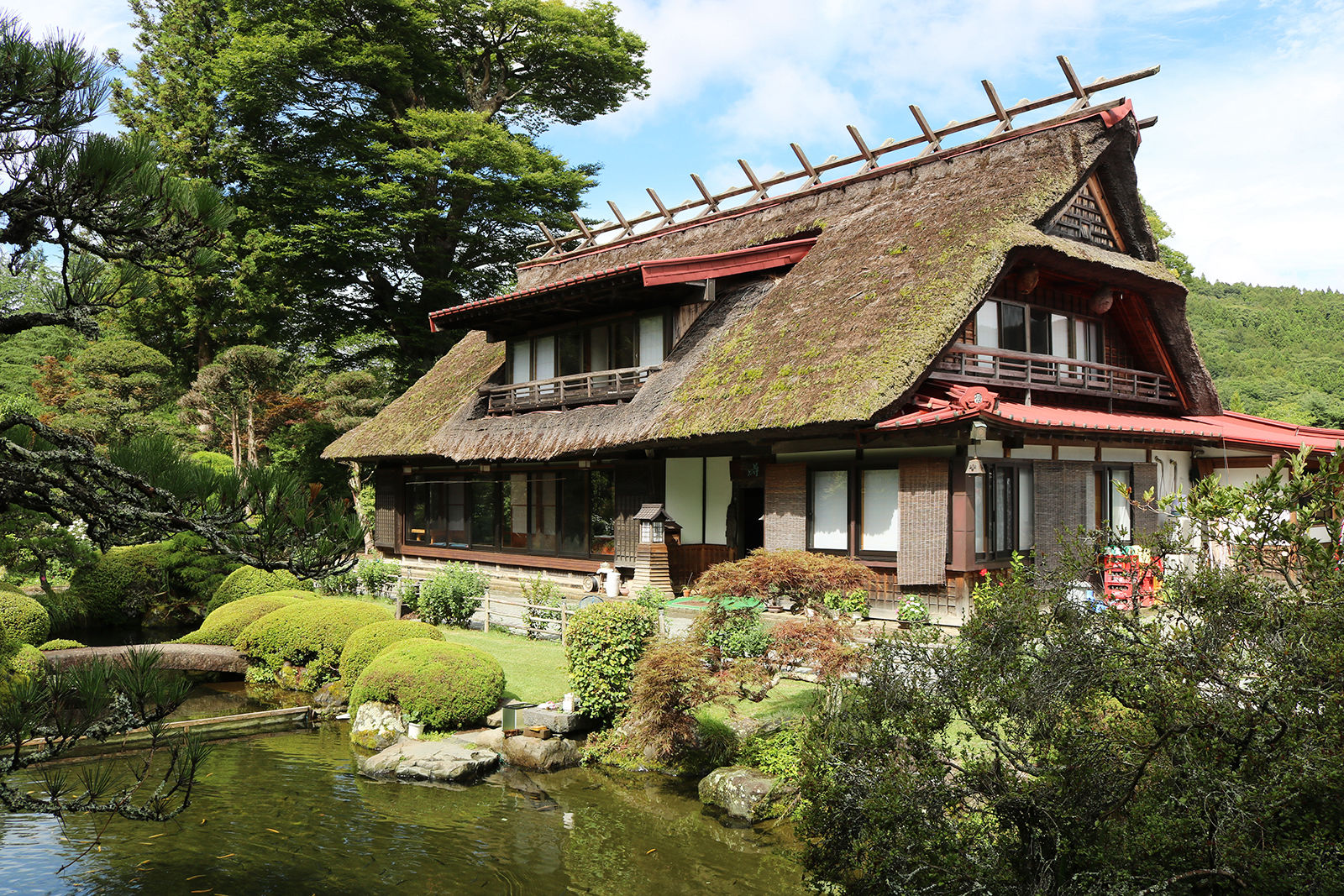 木々の間、湧き水の池の水面を吹き抜ける風が心地良い、富士山を望む茅葺きの古民家で二百年の歴史を