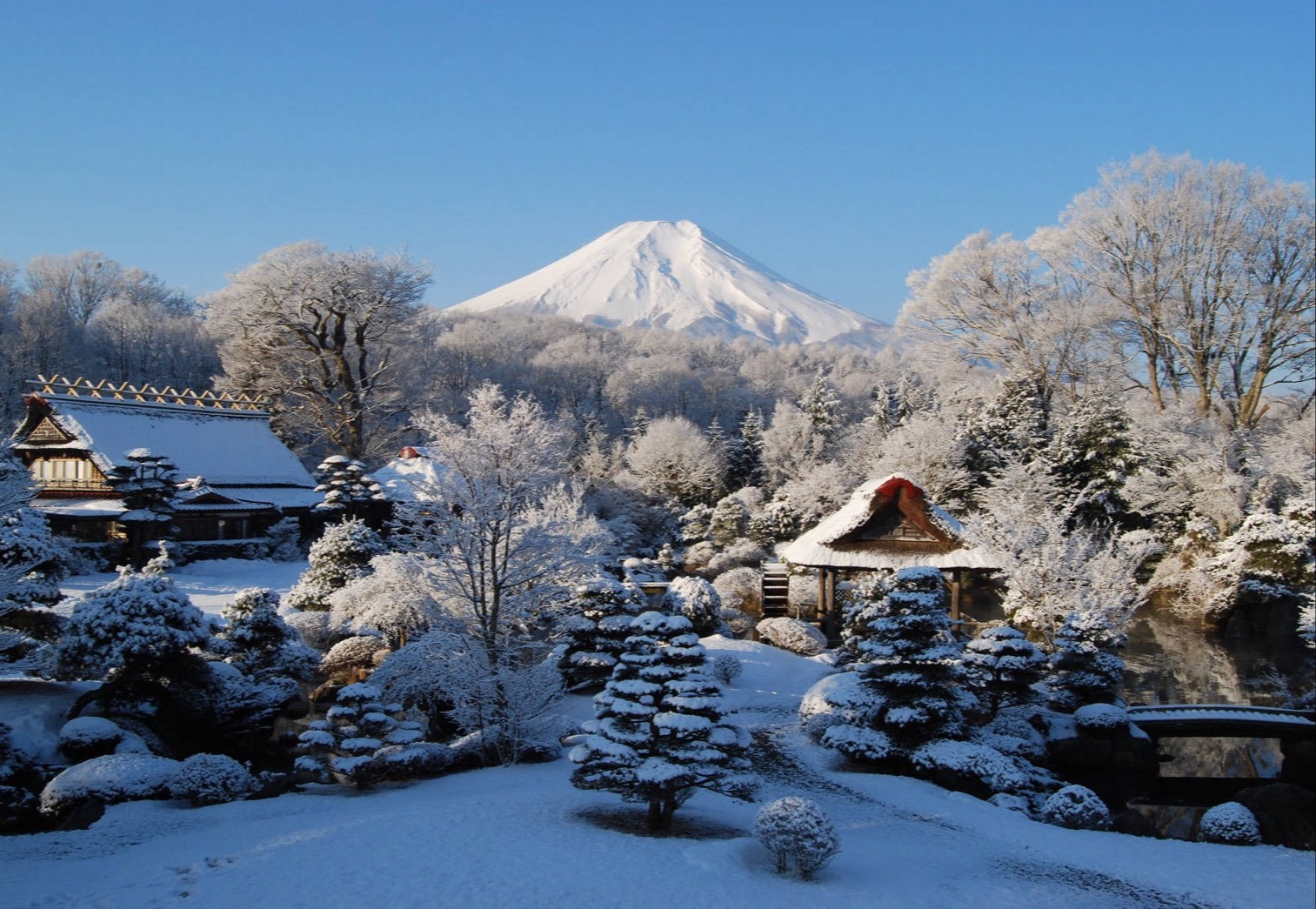 木々の間、湧き水の池の水面を吹き抜ける風が心地良い、富士山を望む茅葺きの古民家で二百年の歴史を肌で感じていただきたい。